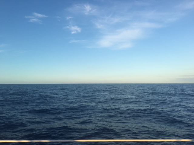 Koko yön kestänyt tuuli oli jättänyt jälkeensä aallot, jotka seurasivat meitä sinnikkäästi aamusta asti. Ne painoivat venettämme sivukeinuun. Tänä aamuna näin ensimmäisen delfiinin. Se pyrähti muutamalla hypyllä veneemme vierestä ja kohtaaminen oli pian ohi. Vähän myöhemmin näin merikilpikonnan kelluvan aaltojen mukana, ja pohdimme minneköhän se oli menossa. Leidi Luova ajatteli että konna varmaan kopsahtaa jossain vaiheessa rantaan ja löytää sieltä partnerin. Ympärillämme ei näkynyt muuta kuin merta. Pikkuhiljaa uskalsin jo alkaa toivoa, että pahoinvointini ei palaisi.