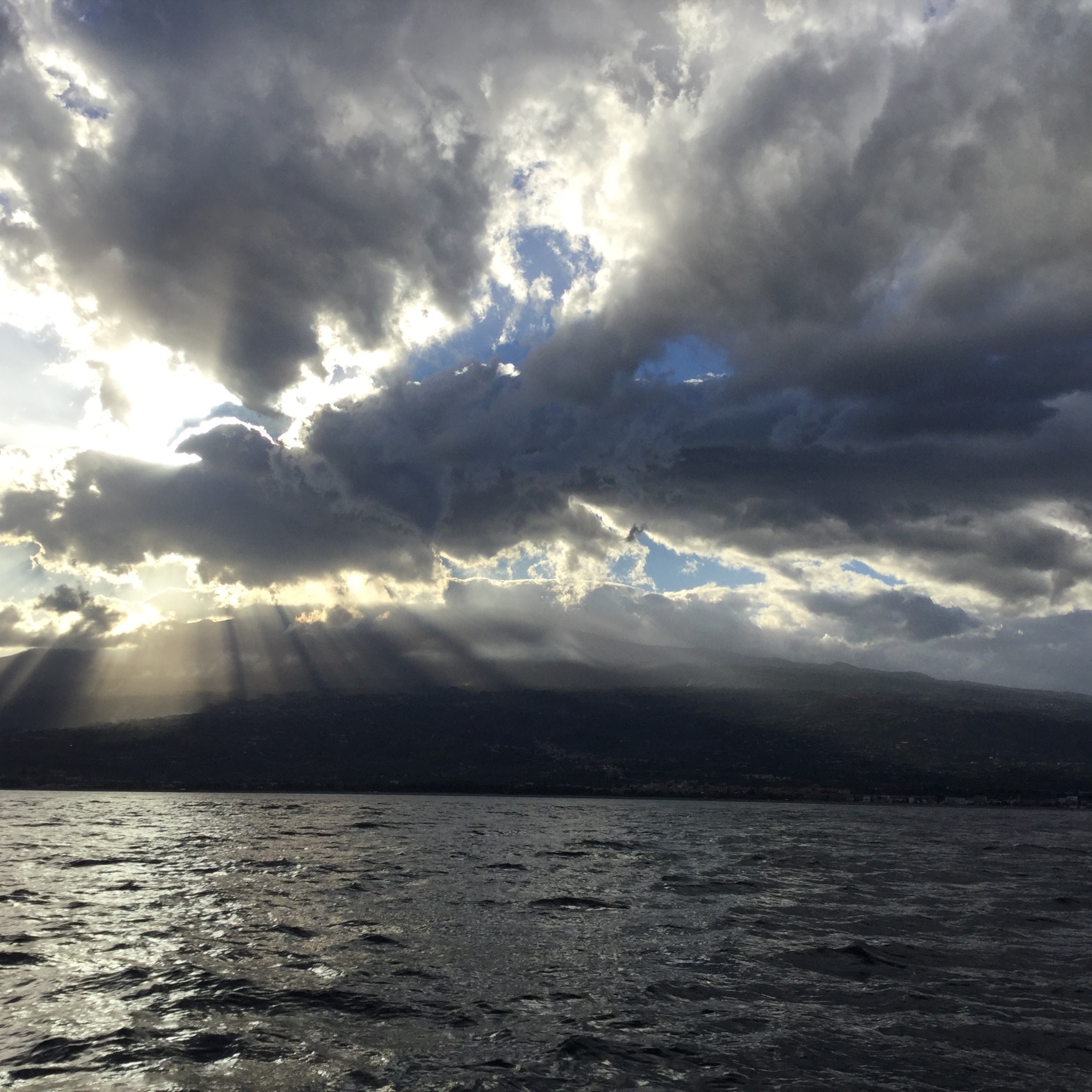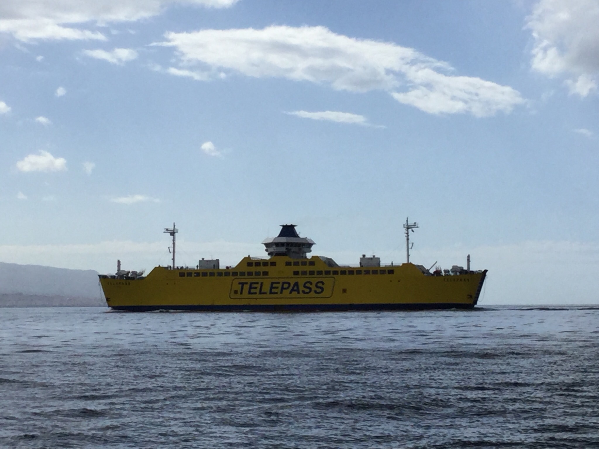 Olimme vaihtaneet vahtivuoroa yhden ja kahden välillä yöllä. Jätimme Kapteenin hitaasti väistyvän, viimeiset kolme tuntia venettä kiertävän myrskyn keskelle. Vannotimme Leidi Luovan kanssa kapteenia herättämään meidät, jotta Kapteeni ehtisi vielä torkahtaa ennen saapumistamme Messinaan. (Ei herättänyt, vaan valvoi itse lähes vuorokauden putkeen). Meidän oli tarkoitus mennä ankkuripaikalle ennen salmea pulahtamaan aamu-uinnille. Päivän herätessä myrskyn jäljiltä pilvimassa peitti taivaan, tuuli puhalsi purjeisiin ja veneemme lipuu määrätietoisesti kohti salmea. Ankkuripaikka ei houkutellut uimaan (vieressä oli telakka ja ilma oli viileä), joten painelimme salmea kohti. Salmi avautui huikeana edessämme. Virtaukset tekivät mereen kuvioita, veden pinta vaihtui sileästä kuohuvaan (vesi kiehui, sanoi Kapteeni). Livuimme salmea pitkin ja katoimme sitlooraan (Leidi Luovan sanavarastossa sitloota) aamupalan. Lossit, rahtilaivat, autolautat ja konttilaivat ympäröivät Kapteenin, Huvikummun ja Leidi Luovan, kahvi tuoksui ja meri kuohui. Hetki oli ainutlaatuinen.