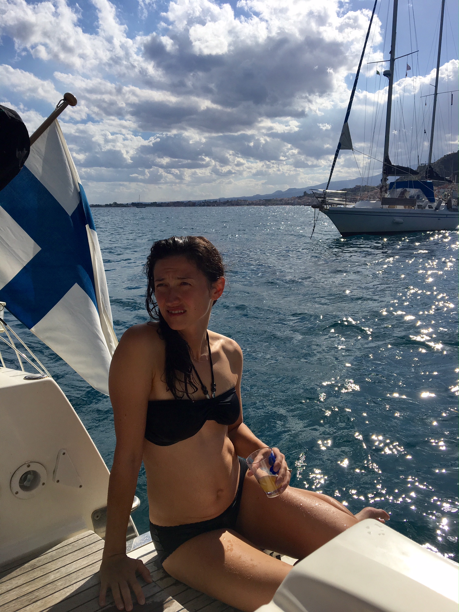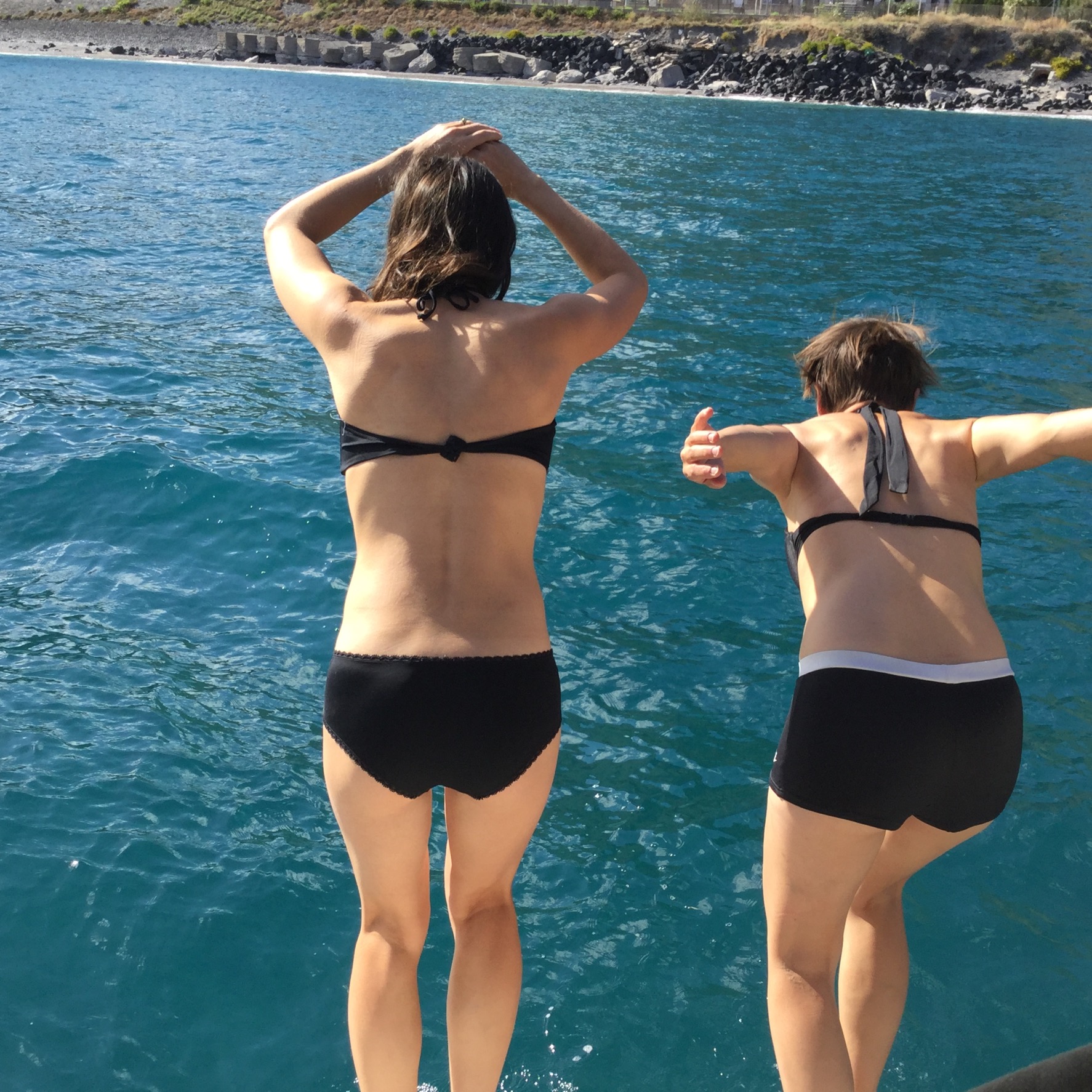 Pysähdyimme yhdeksän mailia ennen määränpäätämme ankkuriin. Kapteeni patisti Huvikummun ja Leidi Luovan turkoosin väriseen veteen, tosin kovin pitkää suostuttelua ei tarvittu. Yksi, kaksi, kolme ja hyppy. Siellä he ovat, niin tyytyväisinä kuin kaksi äitiä reissussa voivat olla. (Seuraavana päivänä Huvikumpu ja Leidi Luova ajoivat Taorminaan ja katsastivat laguunit ylhäältäpäin.)
