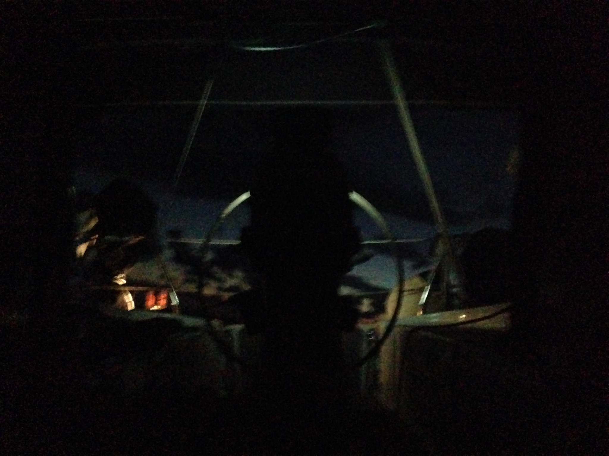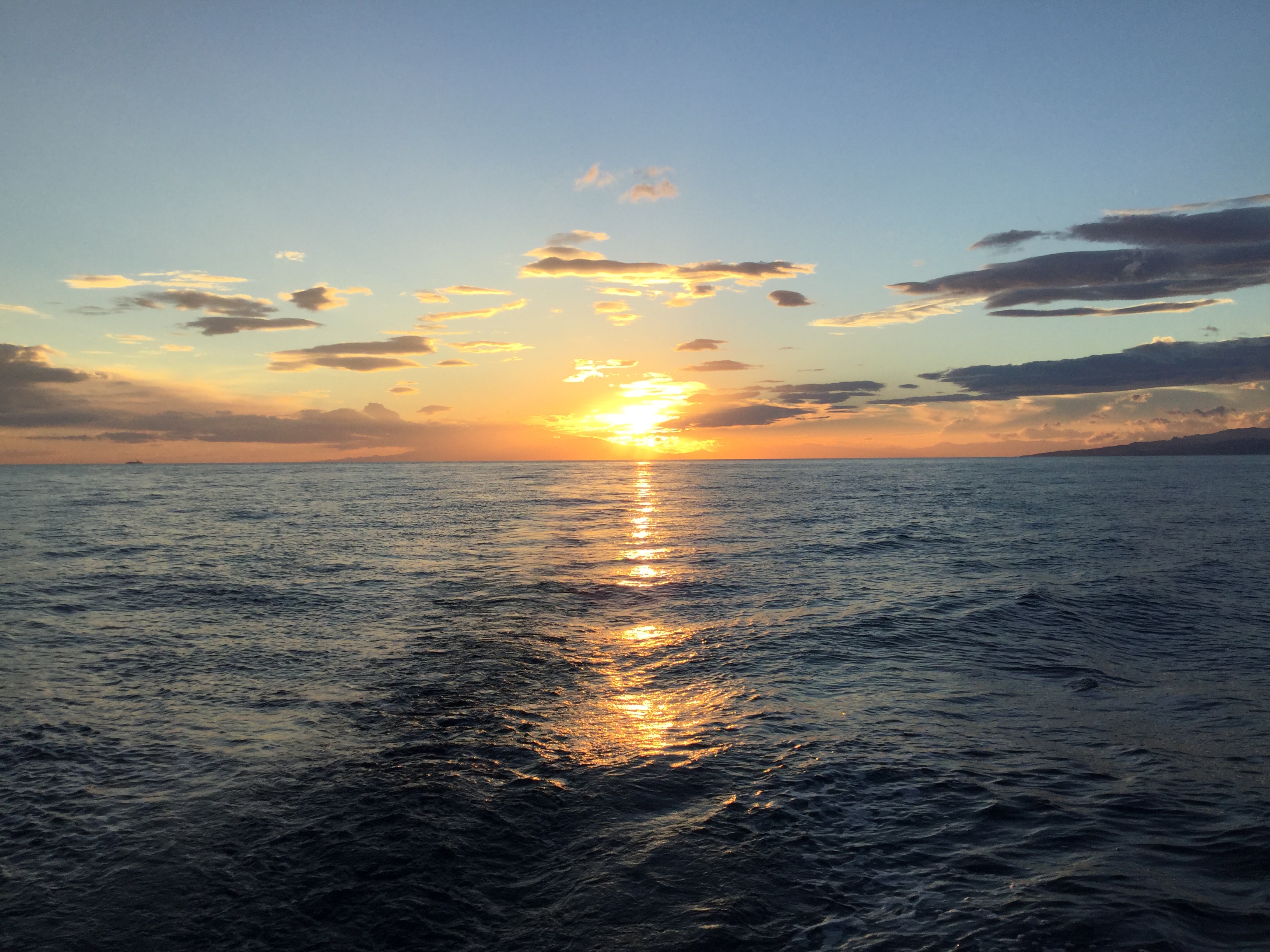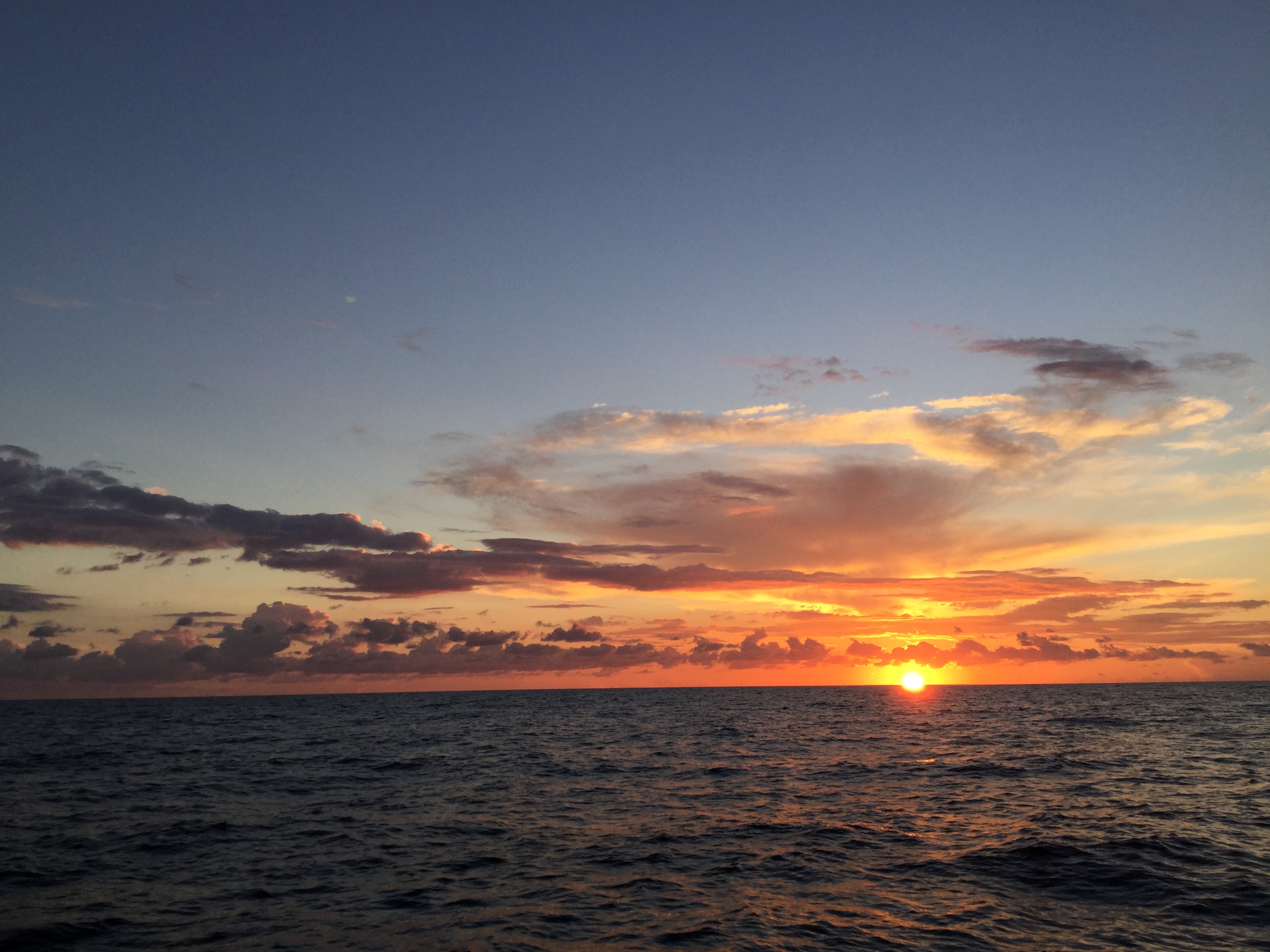 Kompassin sekoamisen syyksi löytyi kompassin magneetin viereen jätetyt latauslaitteet, jotka sekoittivat sen suunnan. Pääsimme jatkamaan turvallisesti matkaa kohti pimenevää yötä autopilotilla. Aamun vahtivuoromme alkoi huikean auringonnousun siivittämänä. Katselimme Leidi Luovan kanssa horisonttia, joka syttyi tuleen punaisen pallon kurkistaessa taivaanrannasta.