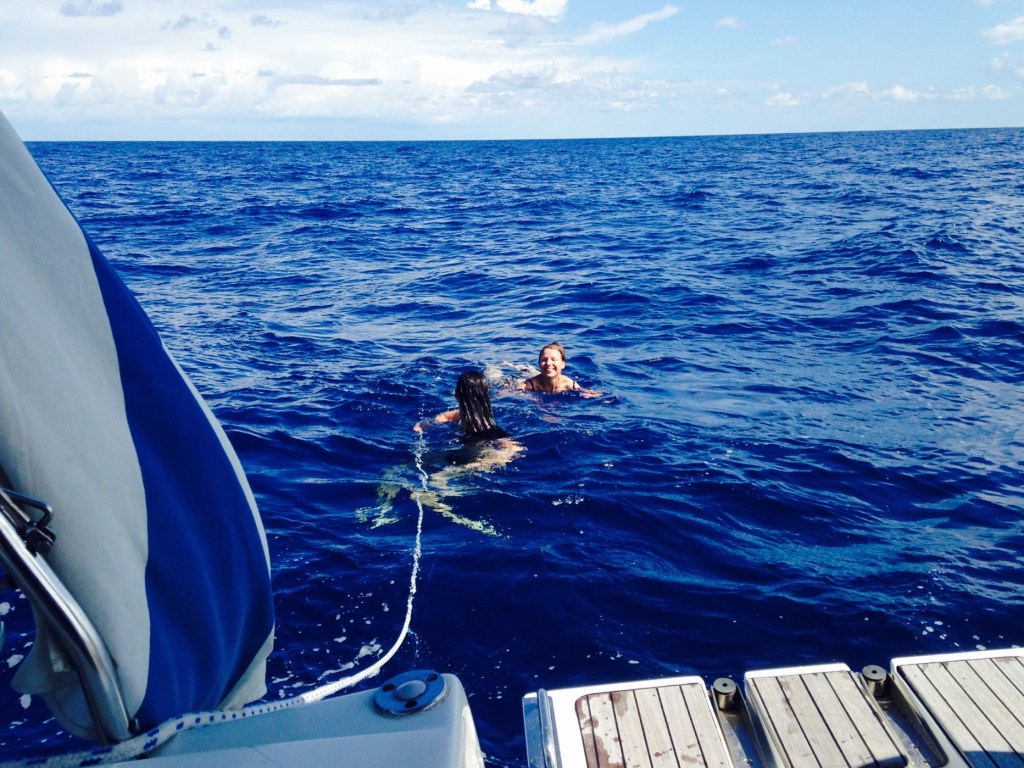 Tänä päivänä oli vihdoin sen verran leuto tuuli, että saimme vedettyä Genaaker-purjeen ylös (Huvikumpu on koko matkan ajan luullut purjetta ‘kenaakkeliksi’). Liu’uimme meressä ottaen valokuvia upeasta purjeesta ja nauttien auringon lämmöstä. Veneessä vallitsi seesteinen tunnelma. Leidi Luova ehdotti uintia. Huvikumpu empi; veden syvyys oli 3 km. Yht’äkkiä kuului kova pamaus, genaakkeri tippui veteen ja alkoi liukua aaltojen mukana. Saimme vedettyä purjeen takaisin veneeseen, ja sidottua sen kiinni laitaan. Nyt oli hyvä aika käydä pulahtamassa, sillä vene ‘pysähtyi’, eli lähinnä lainehti laineiden mukana. Kapteeni päästi köyden veteen ja Leidi Luova ja Huvikumpu hyppäsivät perään Suomen lipun liehuessa taustalla.