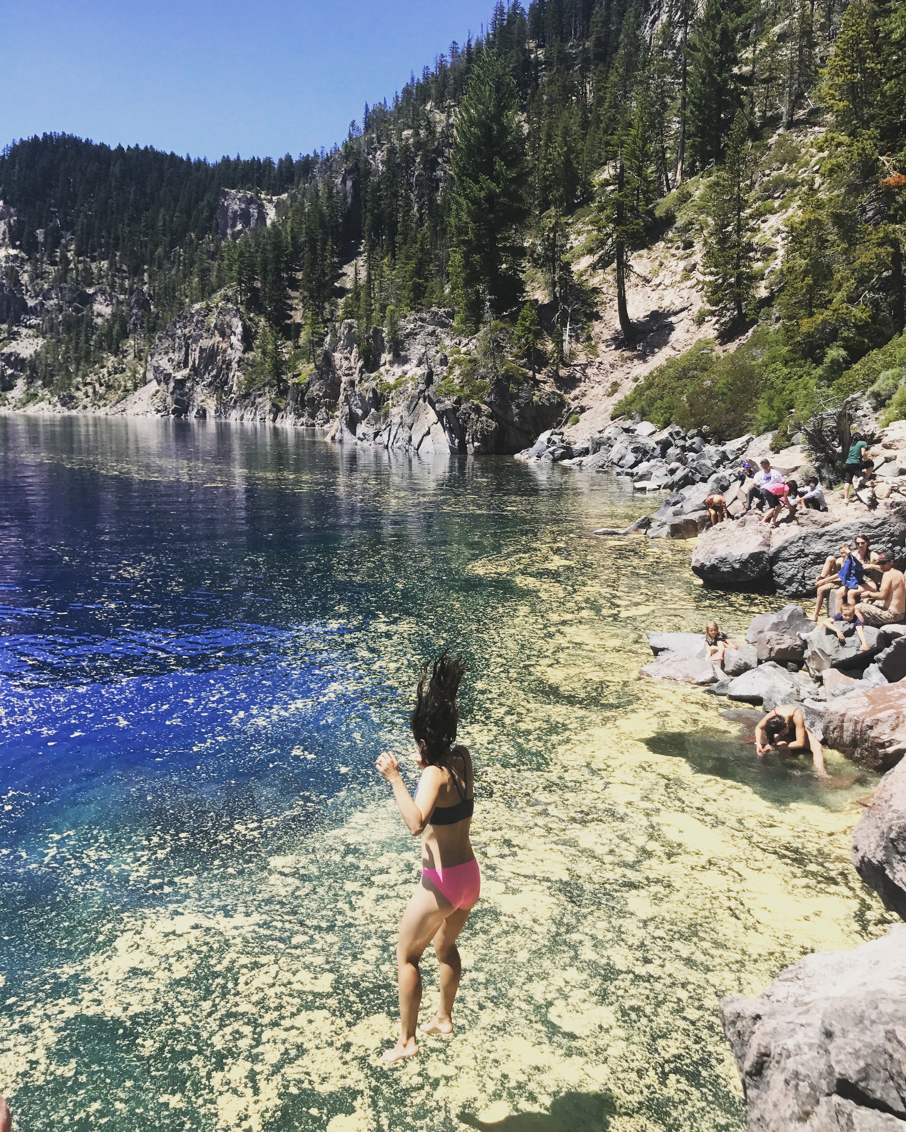 The only path taking down to the lake is Cleetwood Cove Trail, which is a 1.3 mile (one-way) steep path leading to a dock for boat tours and to the rocks from which one can jump into a 10 Celsius degree (50 F) crystal clear water (the yellow is pollen).