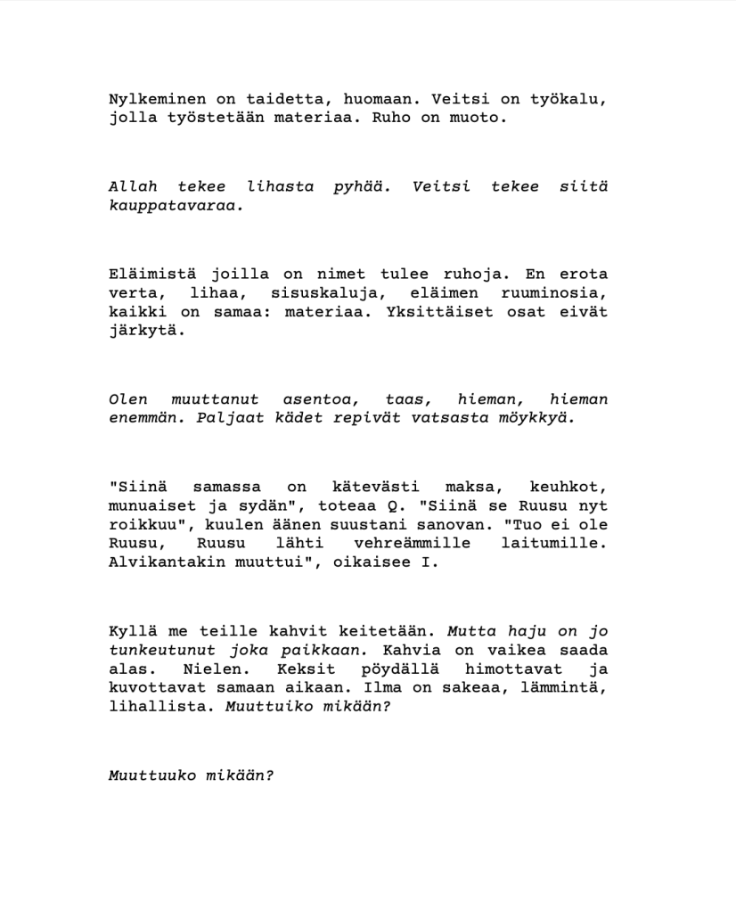 Kun seisoin ensimmäistä kertaa teurastamossa kaksi vuotta sitten, ruudin haju sekoittui vereen ja käteni kirjoitti vimmaisesti kenttämuistiinpanovihkoon suojaten sitä vaistomaisesti roiskeilta. Syntyi oheinen teksti, jonka julkaisin osana KOP -tutkijakollektiivin Metabolismizine-julkaisua.